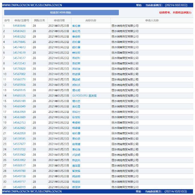 中国商标网显示,由知域互联科技有限公司代理、丽水啸南商贸有限公司申请的149件商标注册,近日被国家知识产权局商标局以不以使用为目的的恶意囤积申请为由予以驳回。